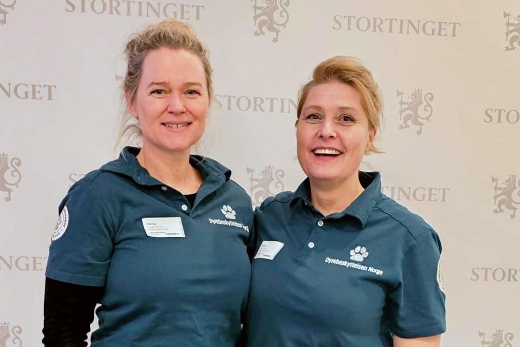 DYREVELFERDSPOLITIKK: Fagrådgiver Eva Breuer Hustoft (t.v.) og veterinær og daglig leder Åshild Roaldset i Dyrebeskyttelsen Norge etter den muntlige høringen av dyrevelferdsmeldingen på Stortinget. FOTO: Dyrebeskyttelsen Norge