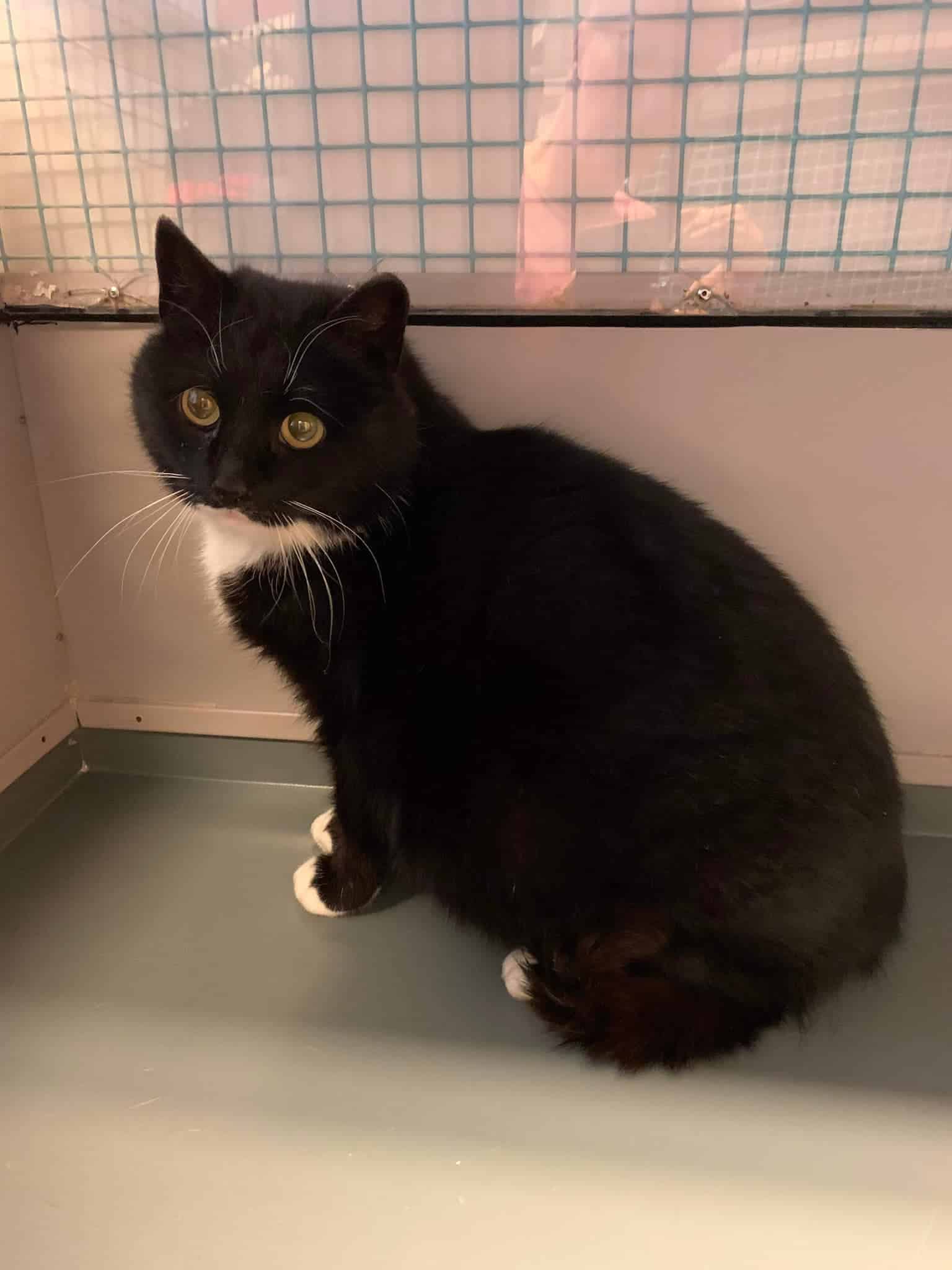 Karoline er ei nydelig pusedame med kort, svart pels med hvitt bryst, labber og «melkebart».