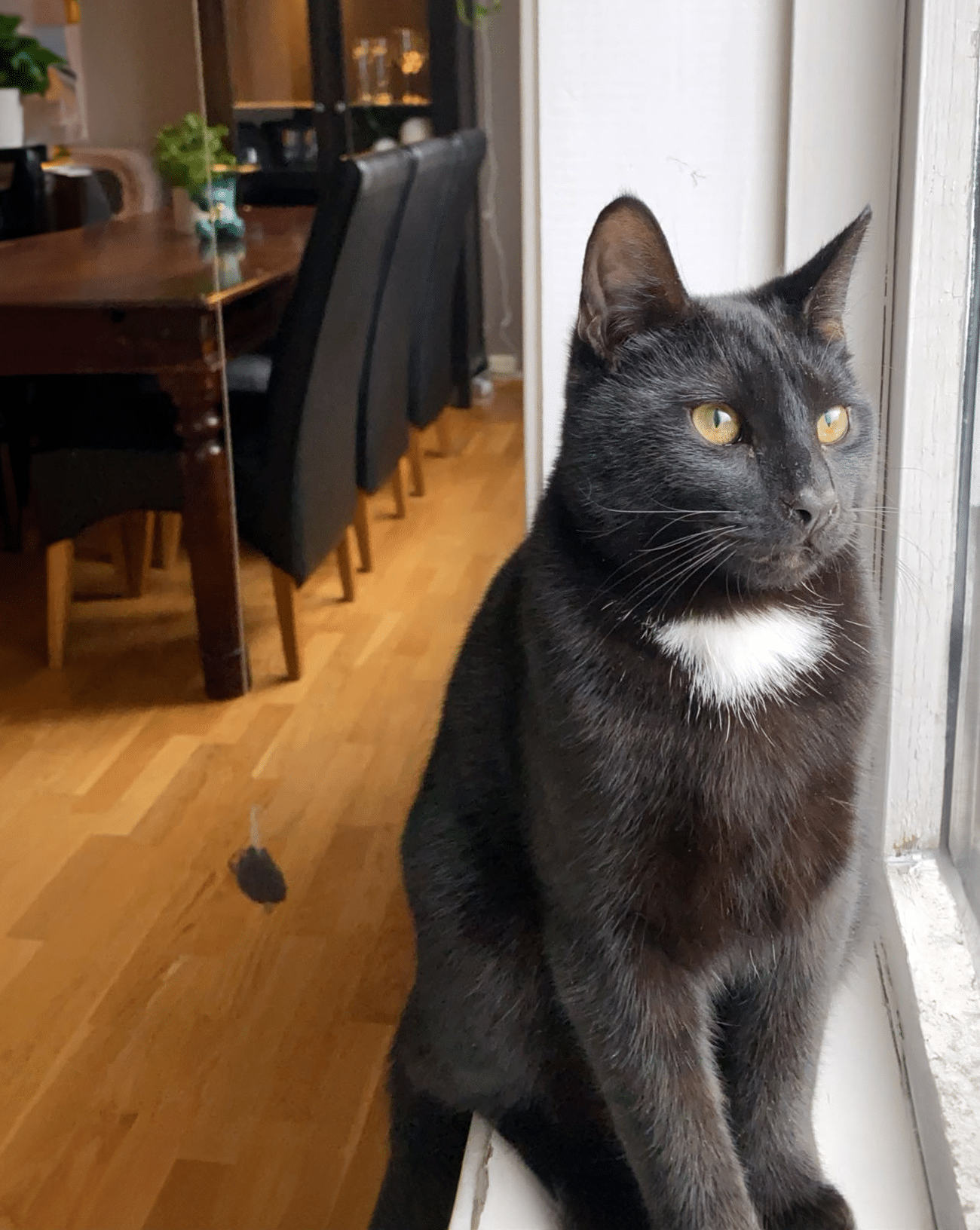 Lyder er en nydelig pusegutt med korthåret sort pels. Han har gule øyne og en karakteristisk hvit flekk på brystet. ♥