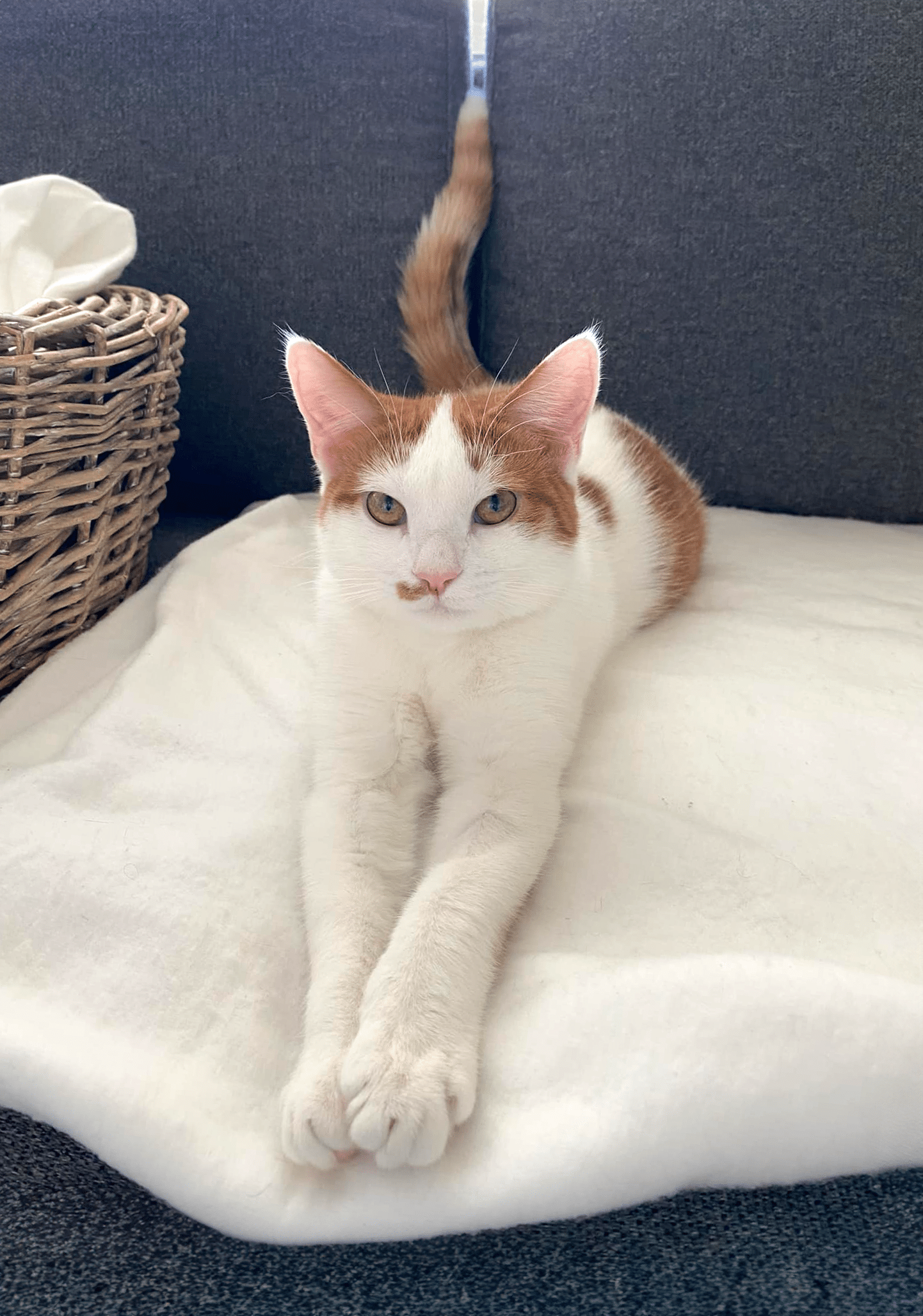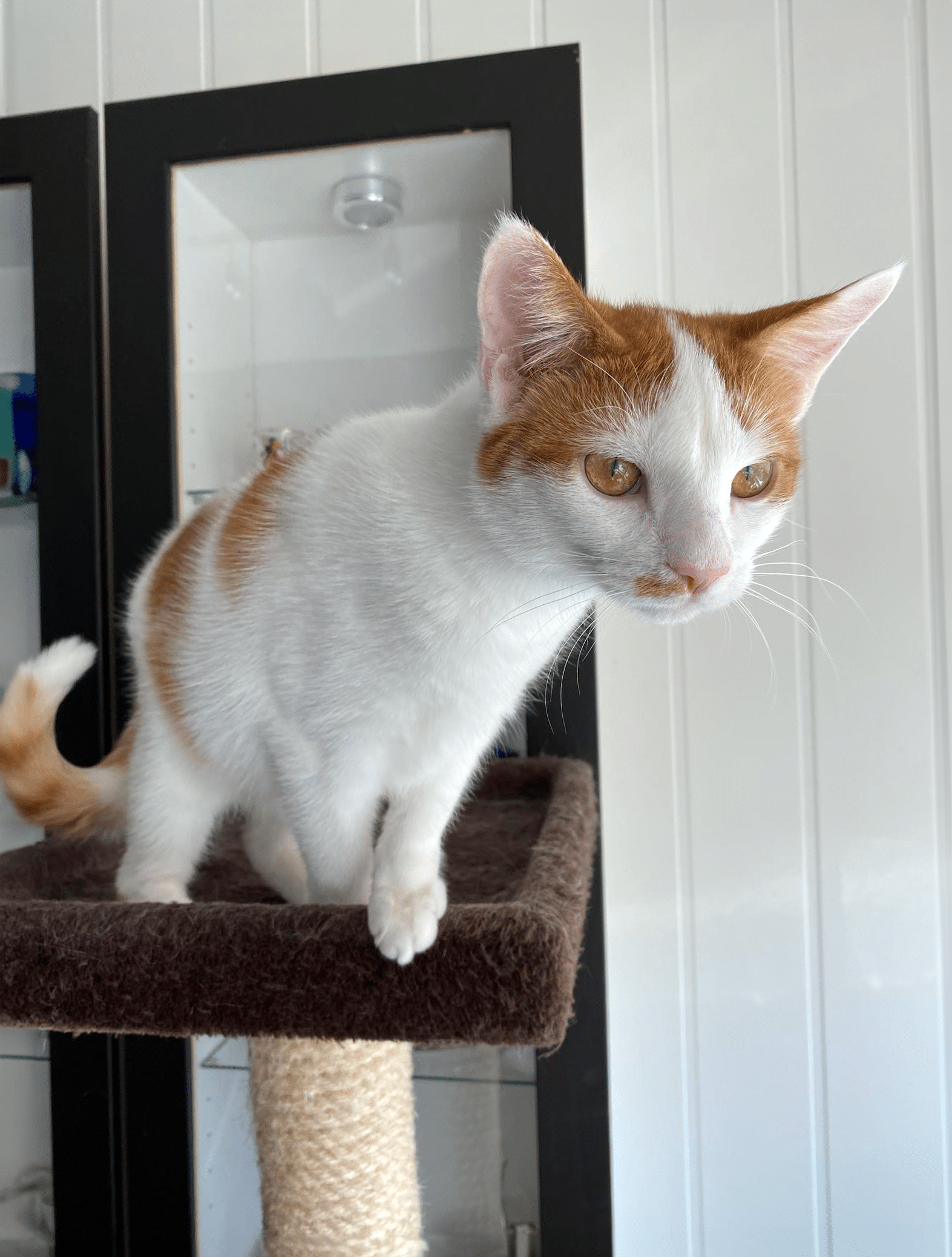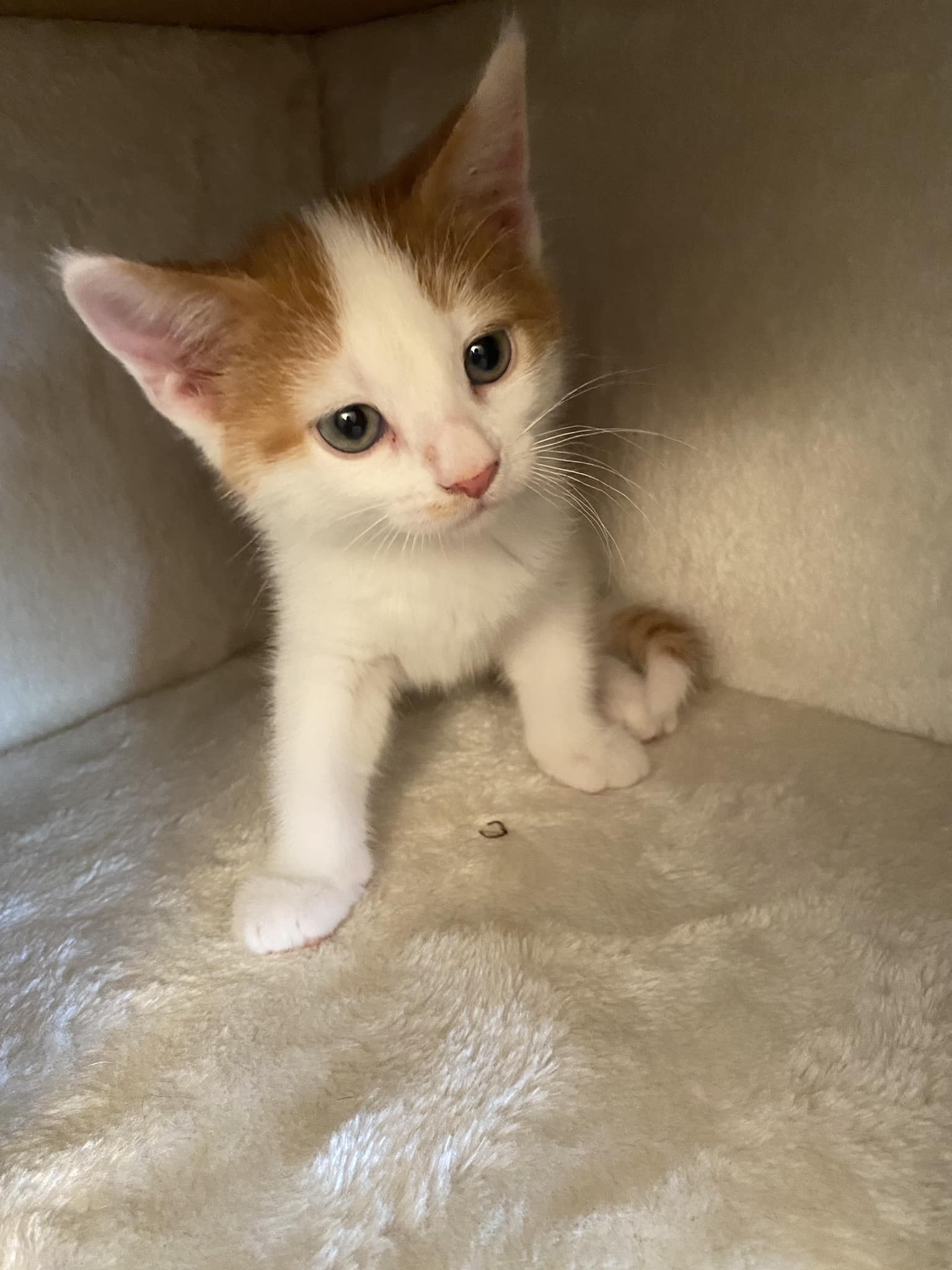 Ragne er ei nydelig pusejente med kort, hvit pels med oransje markeringer. Hun har søte flekker på ryggen som former et potespor!